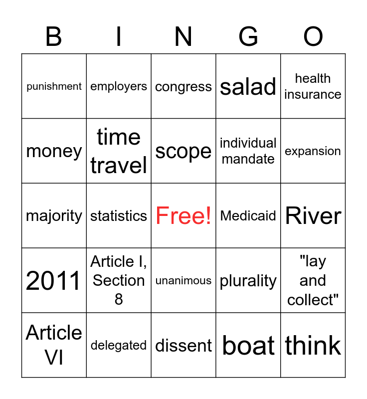 This bingo card has a free space and 24 words: Article I, Section 8, delegated, scope, Article VI, health insurance, punishment, money, employers, Medicaid, unanimous, individual mandate, majority, plurality, "lay and collect", time travel, boat, River, congress, expansion, statistics, think, 2011, salad and dissent.