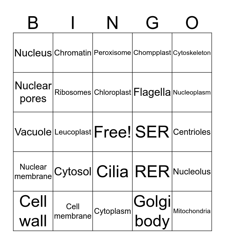 This bingo card has a free space and 24 words: Cytosol, Cell membrane, Chloroplast, Cell wall, Cytoskeleton, Nucleus, Nuclear pores, Chromatin, SER, Cilia, Flagella, Vacuole, RER, Nucleolus, Ribosomes, Golgi body, Centrioles, Peroxisome, Nucleoplasm, Leucoplast, Mitochondria, Nuclear membrane, Chompplast and Cytoplasm.