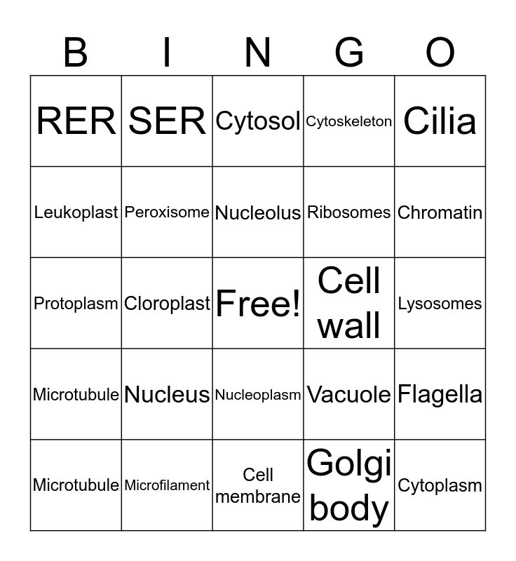 This bingo card has a free space and 24 words: Nucleus, Microfilament, Nucleolus, Microtubule, Cilia, RER, Leukoplast, SER, Cell wall, Nucleoplasm, Ribosomes, Protoplasm, Vacuole, Flagella, Peroxisome, Golgi body, Lysosomes, Cytosol, Chromatin, Cloroplast, Cytoplasm, Microtubule, Cytoskeleton and Cell membrane.