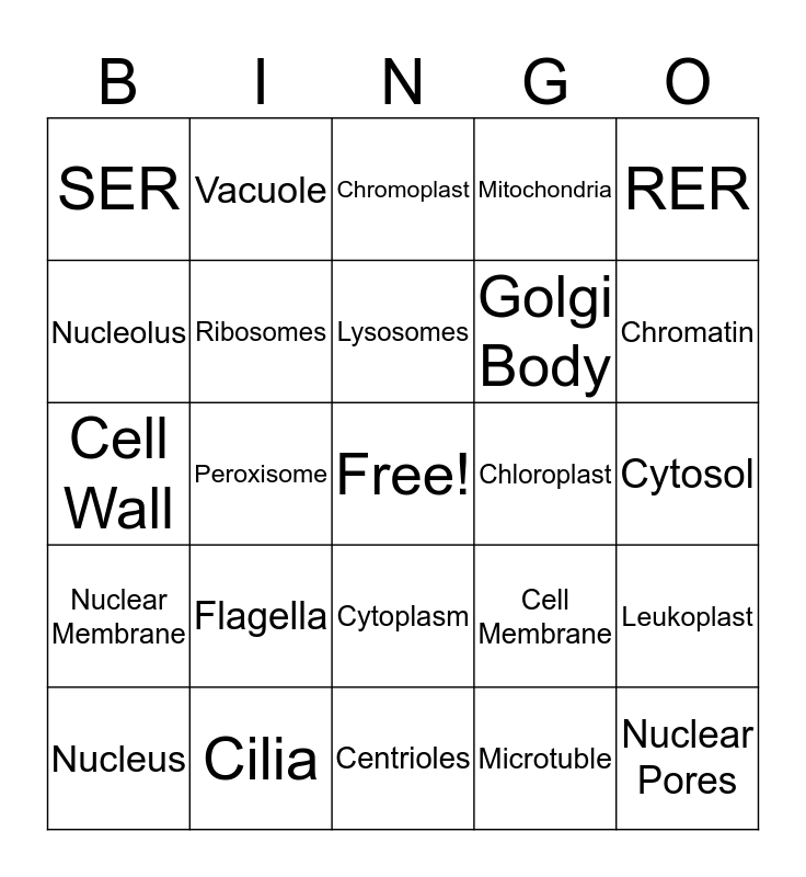 This bingo card has a free space and 24 words: Flagella, Cilia, Lysosomes, Nucleus, RER, SER, Nucleolus, Vacuole, Chloroplast, Cytoplasm, Golgi Body, Cell Wall, Cell Membrane, Leukoplast, Ribosomes, Microtuble, Cytosol, Chromoplast, Chromatin, Peroxisome, Nuclear Pores, Nuclear Membrane, Mitochondria and Centrioles.
