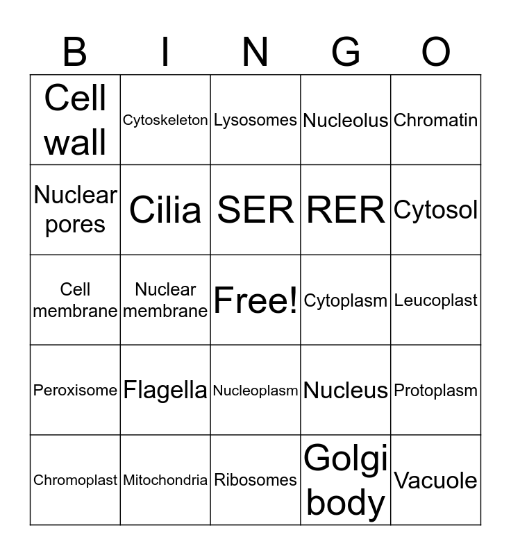 This bingo card has a free space and 24 words: Flagella, Mitochondria, SER, Chromoplast, Chromatin, Cell wall, Nuclear pores, Cytoskeleton, Cytoplasm, Nucleoplasm, RER, Cell membrane, Nucleus, Protoplasm, Cilia, Golgi body, Leucoplast, Lysosomes, Cytosol, Nuclear membrane, Vacuole, Peroxisome, Nucleolus and Ribosomes.