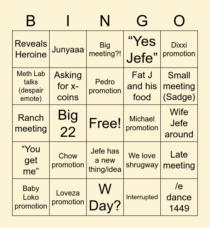 This bingo card has a free space and 24 words: Chow promotion, Loveza promotion, Pedro promotion, Baby Loko promotion, Dixxi promotion, Reveals Heroine, Meth Lab talks (despair emote), Junyaaa, Michael promotion, Jefe has a new thing/idea, Fat J and his food, Ranch meeting, We love shrugway, Late meeting, Asking for x-coins, Interrupted, Wife Jefe around, Big meeting?!, Small meeting (Sadge), Big 22, /e dance 1449, “You get me”, “Yes Jefe” and W Day?.