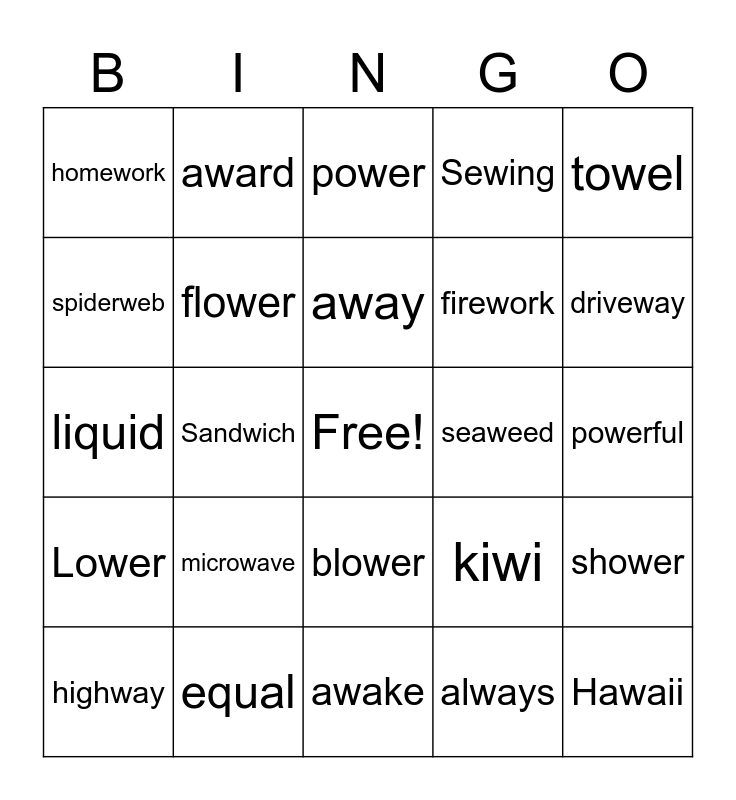 This bingo card has a free space and 24 words: microwave, equal, away, highway, towel, homework, spiderweb, award, seaweed, blower, firework, liquid, kiwi, shower, flower, always, powerful, power, driveway, Sandwich, Hawaii, Lower, Sewing and awake.