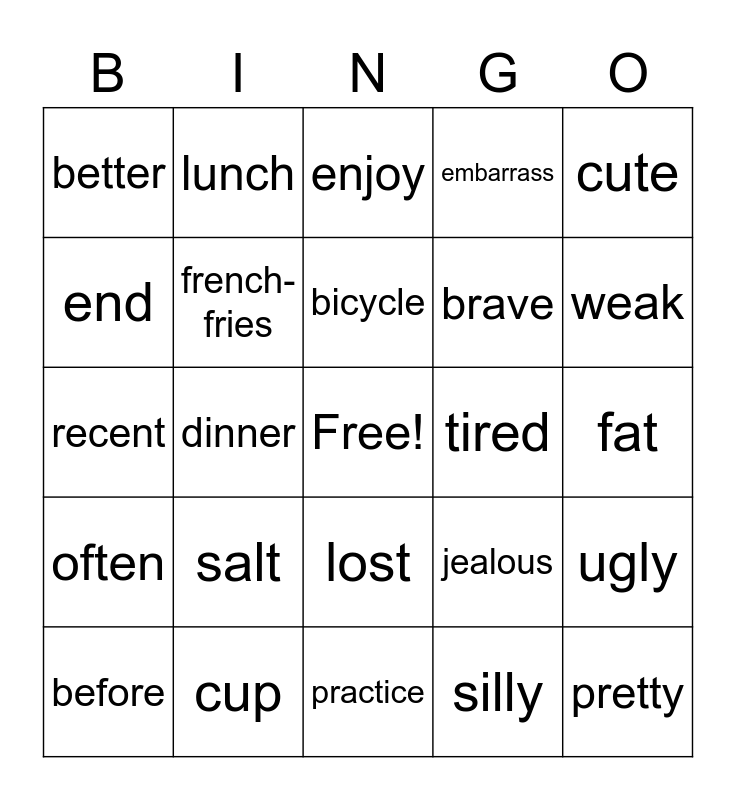 This bingo card has a free space and 74 words: after, a-lot, bicycle, afraid, buzz-cut, what-do, banana, boat, bored, curly hair, before, breakfast, brave, cute, best, cup, build, tired, look-like, better, dinner, enjoy, embarrass, fat, end, plate, find, friendly, fool, few, french-fries, airplane, frustrated, normal, first, french-toast, helicopter, happy, pretty, last, grapes, lost, insult, regular, later, lunch, leave, interesting, skinny, middle, pancake, motorcycle, jealous, tall, most, pepper, practice, mean, short, often, salt, rocket, silly, ugly, recent, soda, search, proud, weak, soon, soup, travel, surprise and healthy.
