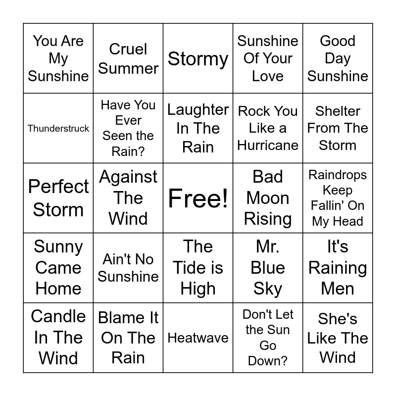 This bingo card has a free space and 24 words: Ain't No Sunshine, Blame It On The Rain, Laughter In The Rain, Candle In The Wind, Good Day Sunshine, You Are My Sunshine, Thunderstruck, Cruel Summer, Bad Moon Rising, The Tide is High, Rock You Like a Hurricane, Perfect Storm, Mr. Blue Sky, It's Raining Men, Have You Ever Seen the Rain?, Don't Let the Sun Go Down?, Raindrops Keep Fallin' On My Head, Stormy, Shelter From The Storm, Against The Wind, She's Like The Wind, Sunny Came Home, Sunshine Of Your Love and Heatwave.