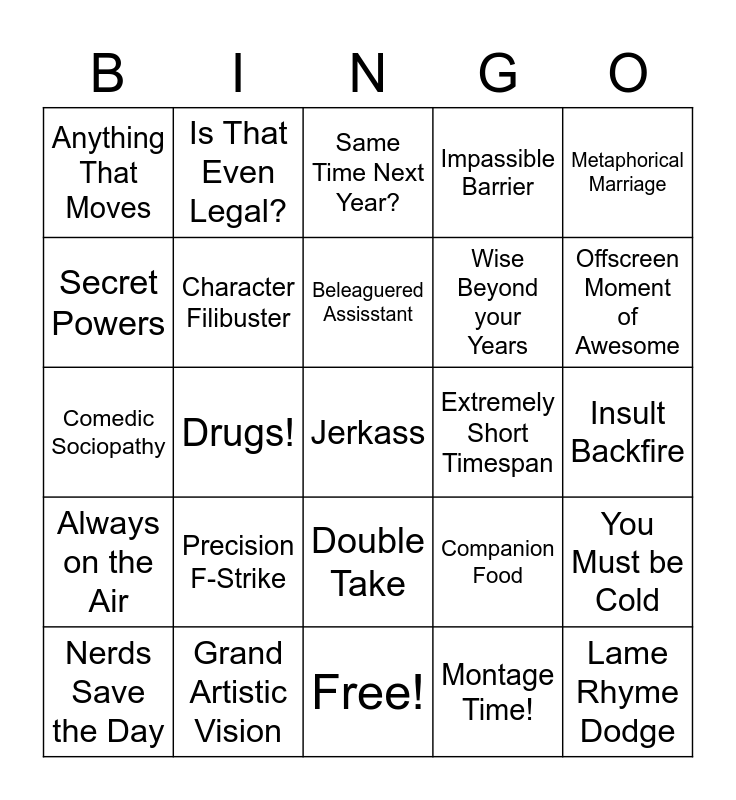 This bingo card has 31 words: Free!, All Girls Want Bad Boys, Drugs!, Angry Chef, Anything That Moves, Same Time Next Year?, Character Filibuster, Companion Food, Extremely Short Timespan, Montage Time!, Insult Backfire, Jerkass, Lame Rhyme Dodge, Obvious Stunt Double, Offscreen Moment of Awesome, Underdogs, You Must be Cold, Precision F-Strike, Always on the Air, Double Take, Metaphorical Marriage, Pool Scene, Nerds Save the Day, Is That Even Legal?, Wise Beyond your Years, Secret Powers, Impassible Barrier, Comedic Sociopathy, Grand Artistic Vision, Beleaguered Assisstant and But Not Too Gay (Inverted).
