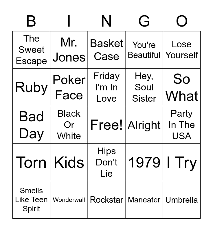 This bingo card has a free space and 29 words: Smells Like Teen Spirit, This Love, Black Or White, Crazy, The Sweet Escape, Basket Case, Poker Face, Kids, Alright, Wonderwall, Party In The USA, Umbrella, Rockstar, Maneater, So What, Year 3000, Hips Don't Lie, Torn, Lose Yourself, Bad Day, 1979, Accidentally In Love, Hey, Soul Sister, Ruby, You're Beautiful, Mr. Jones, I Try, Friday I'm In Love and Right Round.