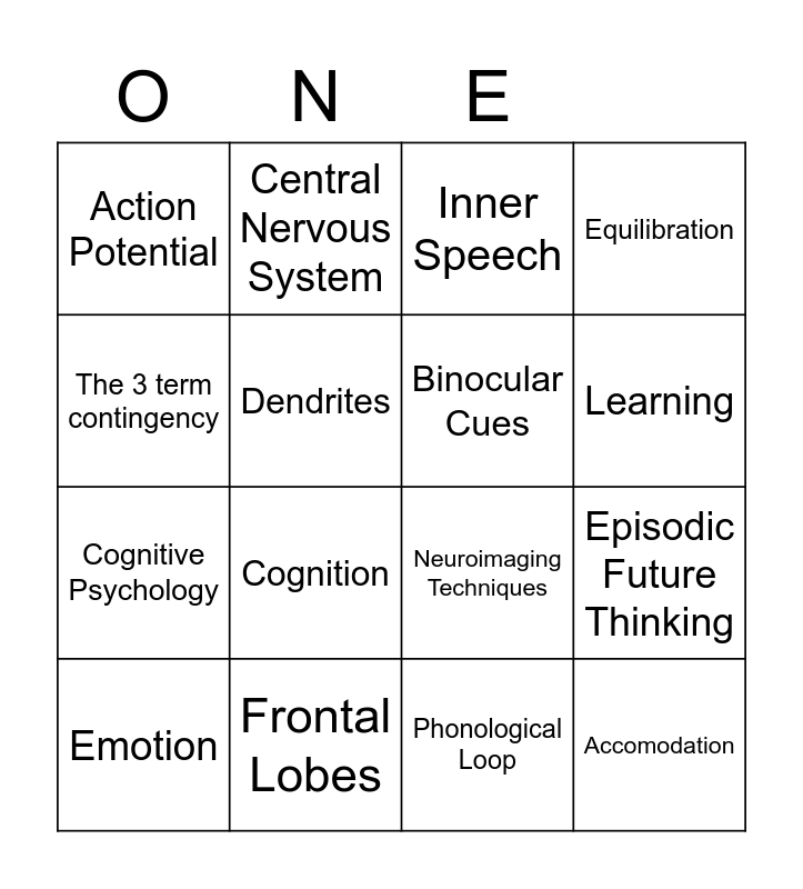 This bingo card has 25 words: Conditions, Stimulus, Learning, Operant Conditioning, The 3 term contingency, Action Potential, Dendrites, Central Nervous System, Frontal Lobes, Thalamus, Cognitive Psychology, Neuroimaging Techniques, Psychophysics, Absolute Threshold, Binocular Cues, Episodic Memory, Phonological Loop, Inner Speech, Cognition, Episodic Future Thinking, Emotion, Automatic Nervous System, Accomodation, Equilibration and Sensorimotor Stage.