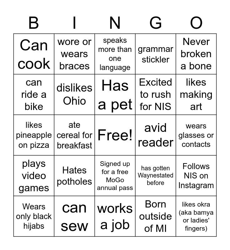 This bingo card has a free space and 24 words: Wears only black hijabs, Hates potholes, Has a pet, Born outside of MI, Never broken a bone, Can cook, wore or wears braces, speaks more than one language, avid reader, wears glasses or contacts, likes pineapple on pizza, dislikes Ohio, has gotten Waynestated before, Follows NIS on Instagram, can ride a bike, can sew, works a job, grammar stickler, likes making art, plays video games, ate cereal for breakfast, Signed up for a free MoGo annual pass, Excited to rush for NIS and likes okra (aka bamya or ladies' fingers).