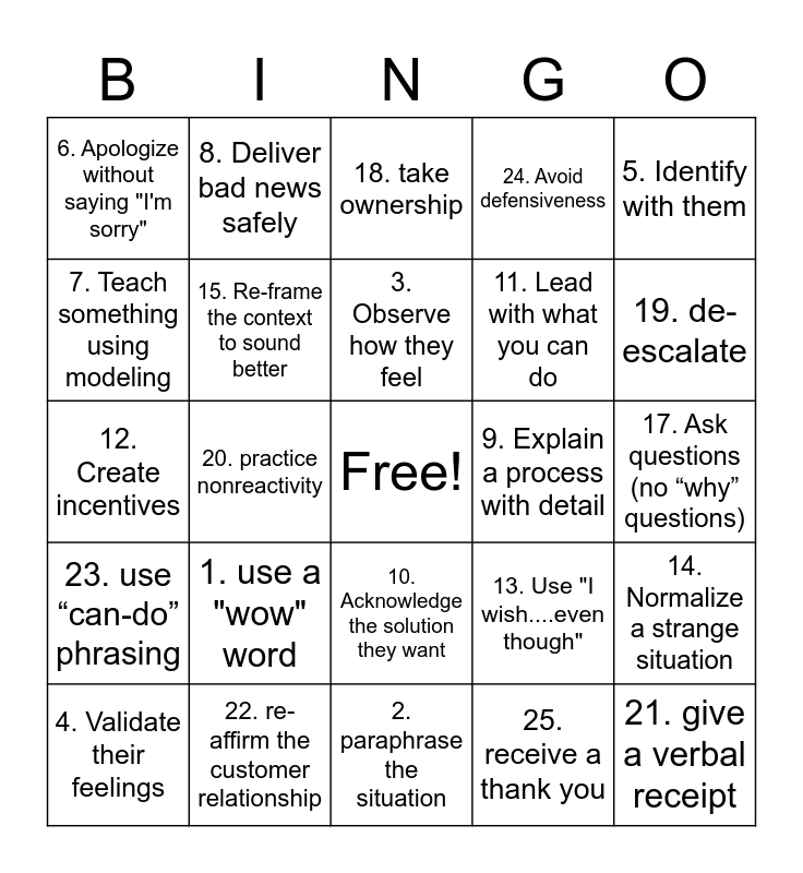 This bingo card has a free space and 25 words: 1. use a "wow" word, 2. paraphrase the situation, 3. Observe how they feel, 4. Validate their feelings, 5. Identify with them, 6. Apologize without saying "I'm sorry", 7. Teach something using modeling, 8. Deliver bad news safely, 9. Explain a process with detail, 10. Acknowledge the solution they want, 11. Lead with what you can do, 12. Create incentives, 13. Use "I wish....even though", 14. Normalize a strange situation, 15. Re-frame the context to sound better, 16. Wait for someone to stop talking without interrupting, 17. Ask questions (no “why” questions), 18. take ownership, 19. de-escalate, 20. practice nonreactivity, 21. give a verbal receipt, 22. re-affirm the customer relationship, 23. use “can-do” phrasing, 24. Avoid defensiveness and 25. receive a thank you.