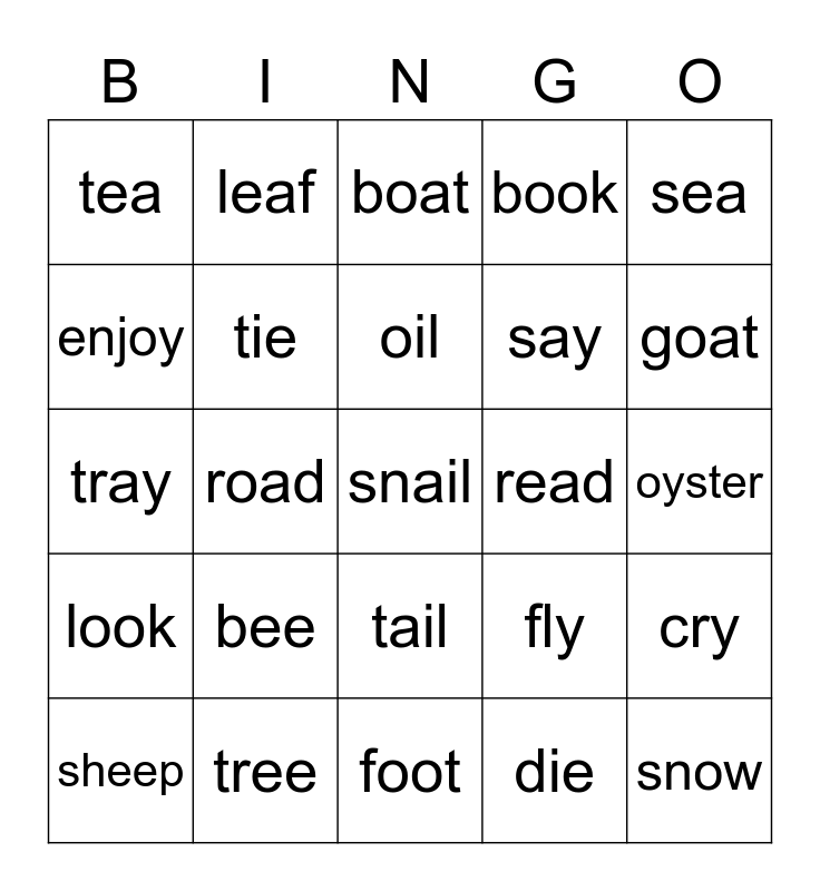 This bingo card has a free space and 24 words: bee, tree, oil, sheep, sea, tea, enjoy, leaf, read, tail, say, tray, fly, cry, tie, die, oyster, boat, goat, road, snow, look, book and foot.