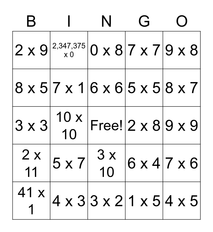 This bingo card has a free space and 24 words: 5 x 7, 4 x 3, 6 x 6, 41 x 1, 9 x 8, 2 x 9, 8 x 5, 2,347,375 x 0, 2 x 8, 3 x 10, 5 x 5, 3 x 3, 6 x 4, 7 x 6, 7 x 1, 1 x 5, 9 x 9, 0 x 8, 8 x 7, 10 x 10, 4 x 5, 2 x 11, 7 x 7 and 3 x 2.