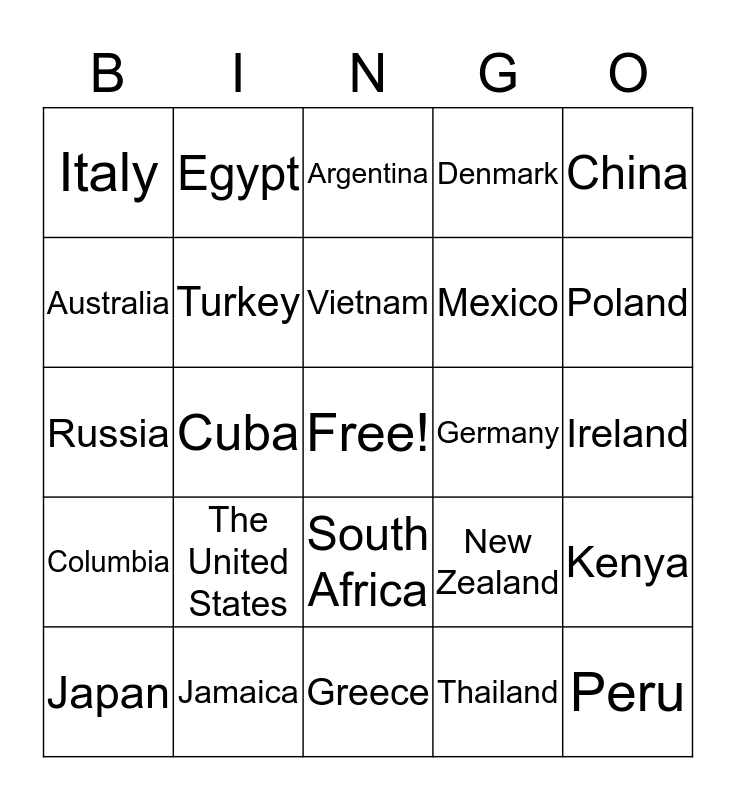 This bingo card has a free space and 24 words: The United States, Jamaica, Vietnam, Japan, China, Italy, Australia, Egypt, Germany, South Africa, Mexico, Russia, New Zealand, Kenya, Turkey, Thailand, Ireland, Argentina, Poland, Cuba, Peru, Columbia, Denmark and Greece.