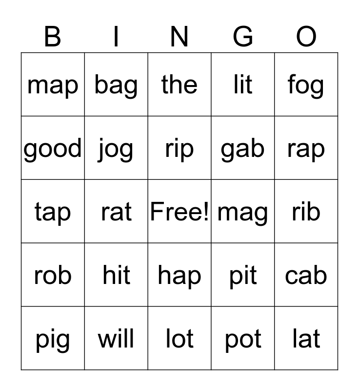 This bingo card has a free space and 34 words: lag, pot, does, hot, rob, jog, fog, pig, bag, cap, rip, the, got, fig, mag, rap, will, tap, hit, pit, hap, pip, map, rib, lot, lat, lit, did, gab, good, cat, rat, cab and lip.