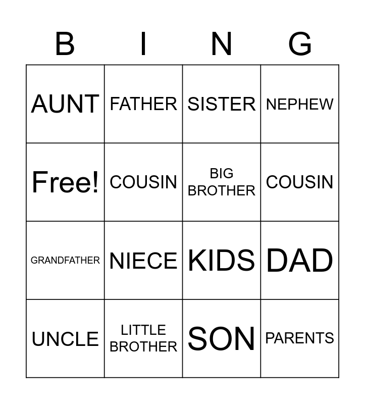 This bingo card has 16 words: LITTLE BROTHER, DAD, SISTER, AUNT, GRANDFATHER, FATHER, KIDS, SON, Free!, COUSIN, UNCLE, NEPHEW, NIECE, COUSIN, BIG BROTHER and PARENTS.