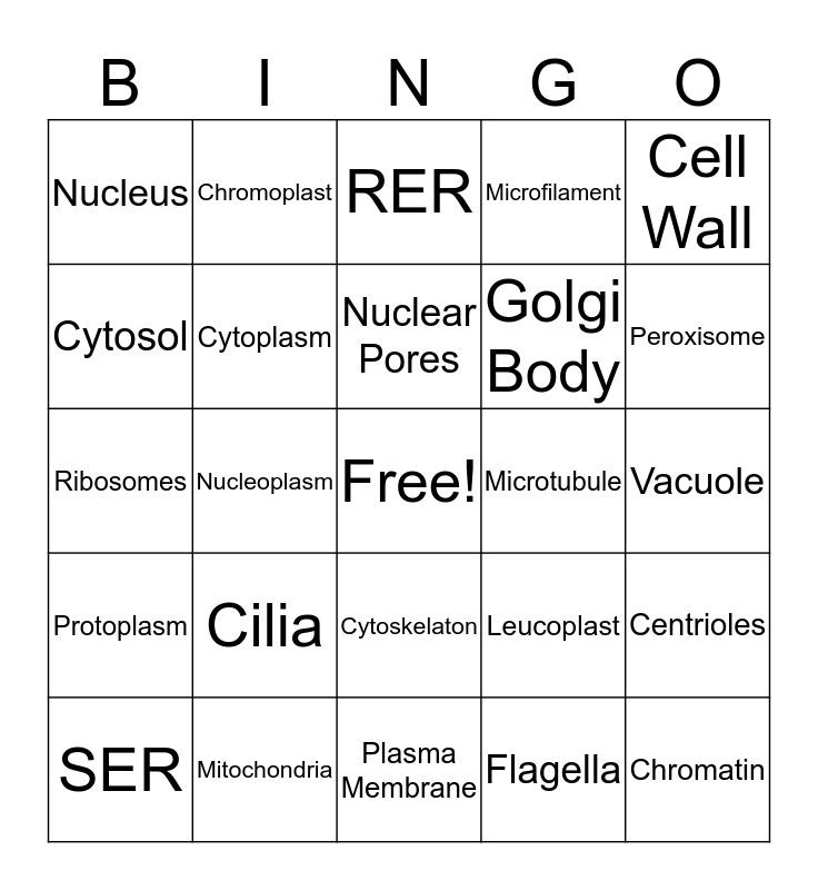 This bingo card has a free space and 24 words: Cilia, Mitochondria, Nuclear Pores, SER, Cell Wall, Nucleus, Cytosol, Chromoplast, Microtubule, Cytoskelaton, Golgi Body, Ribosomes, Leucoplast, Centrioles, Cytoplasm, Flagella, Vacuole, RER, Peroxisome, Nucleoplasm, Chromatin, Protoplasm, Microfilament and Plasma Membrane.