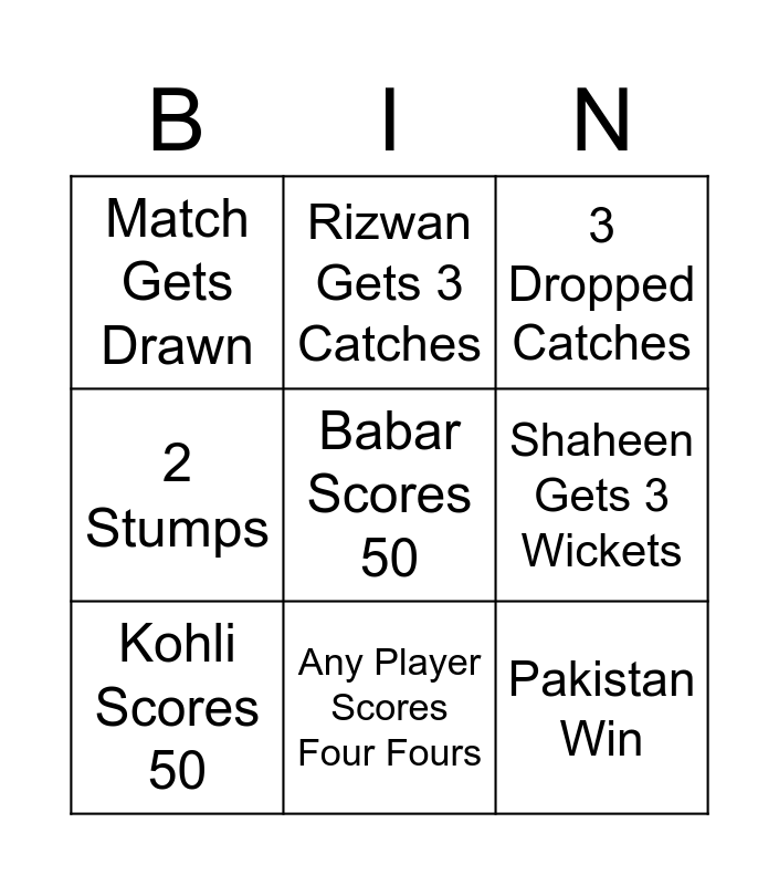 This bingo card has 9 words: Kohli Scores 50, 3 Dropped Catches, Rizwan Gets 3 Catches, 2 Stumps, Match Gets Drawn, Shaheen Gets 3 Wickets, Babar Scores 50, Pakistan Win and Any Player Scores Four Fours.