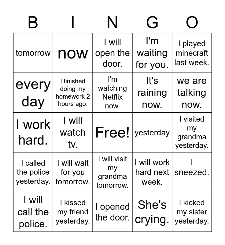 This bingo card has a free space and 24 words: I will wait for you tomorrow., I kissed my friend yesterday., I'm watching Netflix now., I will call the police., I played minecraft last week., tomorrow, every day, now, yesterday, I will visit my grandma tomorrow., It's raining now., I work hard., I will work hard next week., I sneezed., I finished doing my homework 2 hours ago., She's crying., I visited my grandma yesterday., I will open the door., we are talking now., I will watch tv., I kicked my sister yesterday., I called the police yesterday., I'm waiting for you. and I opened the door..