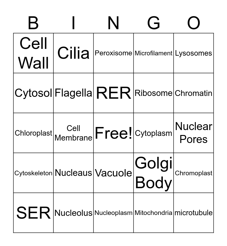 This bingo card has a free space and 24 words: Nucleaus, Nucleolus, RER, SER, Lysosomes, Cell Wall, Cytosol, Cilia, Cytoplasm, Vacuole, Ribosome, Chloroplast, Golgi Body, Chromoplast, Flagella, Mitochondria, Nuclear Pores, Peroxisome, Chromatin, Cell Membrane, microtubule, Cytoskeleton, Microfilament and Nucleoplasm.