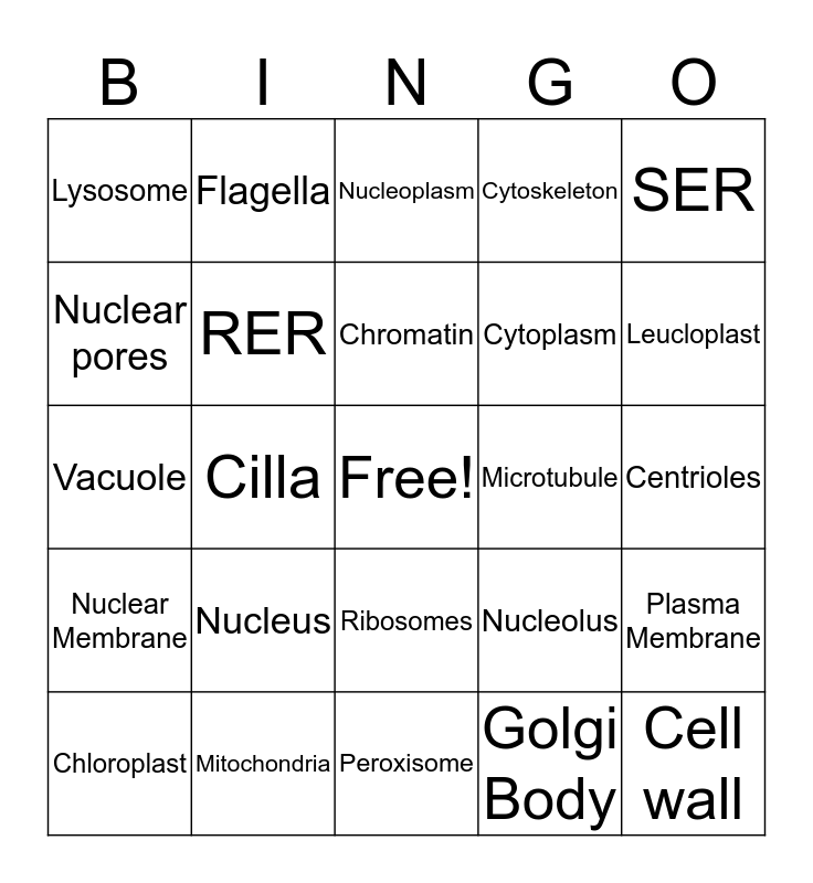 This bingo card has a free space and 24 words: Nucleus, Mitochondria, Chromatin, Chloroplast, SER, Lysosome, Nuclear pores, Flagella, Microtubule, Ribosomes, Cytoplasm, Vacuole, Nucleolus, Plasma Membrane, RER, Golgi Body, Centrioles, Nucleoplasm, Leucloplast, Cilla, Cell wall, Nuclear Membrane, Cytoskeleton and Peroxisome.