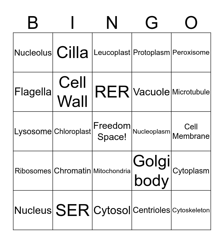 This bingo card has a free space and 24 words: Chromatin, SER, RER, Nucleus, Peroxisome, Nucleolus, Flagella, Cilla, Nucleoplasm, Mitochondria, Vacuole, Lysosome, Golgi body, Cytoplasm, Cell Wall, Centrioles, Cell Membrane, Leucoplast, Microtubule, Chloroplast, Cytoskeleton, Ribosomes, Protoplasm and Cytosol.