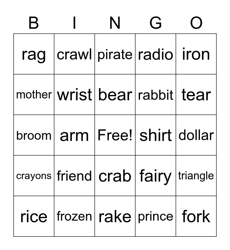 This bingo card has a free space and 57 words: run, rice, rat, rag, rake, red, wrist, raisin, rabbit, ribbon, radio, rocket, carrot, bird, earring, horse, iron, arm, giraffe, fork, shirt, lizard, fairy, pirate, four, bear, deer, ear, tear, pear, jar, alligator, doctor, feather, dollar, mother, bread, broom, brother, crayons, crawl, crab, drive, draw, drink, freckles, friend, frozen, grandpa, greet, grass, prince, practice, prunes, tree, triangle and truck.