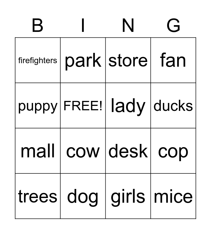 This bingo card has 16 words: dog, cop, store, firefighters, mall, park, desk, girls, puppy, FREE!, trees, fan, cow, ducks, lady and mice.
