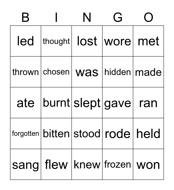 This bingo card has a free space and 24 words: sang, bitten, was, frozen, met, led, thought, lost, gave, ran, ate, chosen, rode, held, thrown, flew, knew, wore, made, forgotten, burnt, stood, hidden and won.
