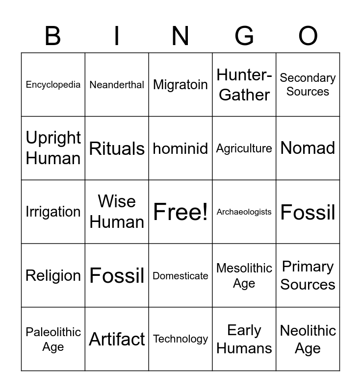 This bingo card has a free space and 24 words: Fossil, Artifact, hominid, Paleolithic Age, Secondary Sources, Encyclopedia, Upright Human, Neanderthal, Archaeologists, Domesticate, Agriculture, Irrigation, Mesolithic Age, Primary Sources, Rituals, Early Humans, Fossil, Migratoin, Nomad, Wise Human, Neolithic Age, Religion, Hunter-Gather and Technology.
