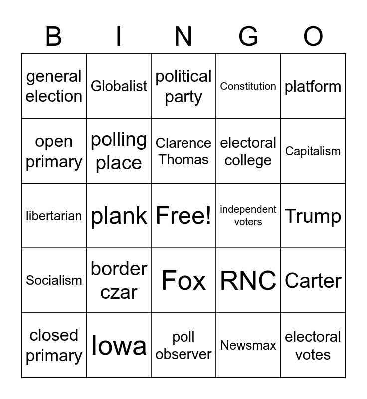 This bingo card has a free space and 82 words: volunteers, political action committees(PACS), political party, nominate, candidate, political spectrum, two-party system, multiparty system, coalition, one-party system, third parties, precincts, polling place, independent voters, primary election, general election, closed primary, open primary, secret ballot, popular vote, elector, electoral college, electoral votes, platform, plank, snowflakes, Libs, conservative, republican, democrat, border czar, bailout, libertarian, working class, grassroots, poll observer, GOP, GDP, Capitalism, Democracy, Republic, Constitution, Independence, Free Trade, Debt, Globalist, Mandates, Clarence Thomas, Congress, Judicial Branch, Biden, Trump, Iowa, Caucus, Killary, Obama, Pence, Kamala, Build the wall, RNC, DNC, Convention, Socialism, AOC, Bernie Sanders, Pompeo, Red Pill, Red Kingdom, DeSantis, Climate Change, ESG, Equity, Fox, Newsmax, Reagan, Bush, Elite, LGBTQABC#@!, Communism, Lincoln, Carter and The Best Doctor Jill.