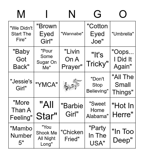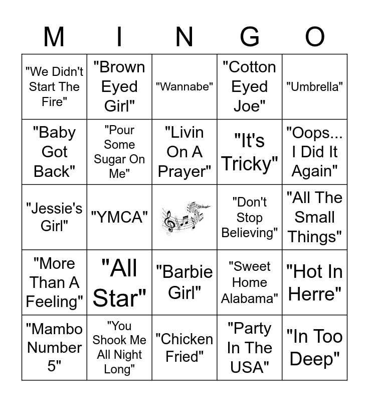 This bingo card has a free space and 34 words: "The Chain", "Party In The USA", "Bad Romance", "Sweet Caroline", "More Than A Feeling", "Pour Some Sugar On Me", "Umbrella", "Mambo Number 5", "Brown Eyed Girl", "Stacy's Mom", "Livin On A Prayer", "Wannabe", "Build Me Up Buttercup", "Africa", "Don't Stop Believing", "Oops... I Did It Again", "You Shook Me All Night Long", "Jessie's Girl", "All Star", "Sweet Home Alabama", "Barbie Girl", "Walk This Way", "We Didn't Start The Fire", "All The Small Things", "Chicken Fried", "In Too Deep", "Cotton Eyed Joe", "U Can't Touch This", "It's Tricky", "Baby Got Back", "This Is How We Do It", "YMCA", "Hot In Herre" and "The Fresh Prince of Bel-Air".