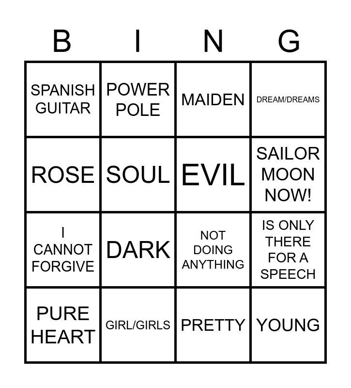 This bingo card has 16 words: PURE HEART, GIRL/GIRLS, MAIDEN, DREAM/DREAMS, ROSE, POWER POLE, NOT DOING ANYTHING, IS ONLY THERE FOR A SPEECH, SPANISH GUITAR, SOUL, PRETTY, SAILOR MOON NOW!, I CANNOT FORGIVE, DARK, EVIL and YOUNG.