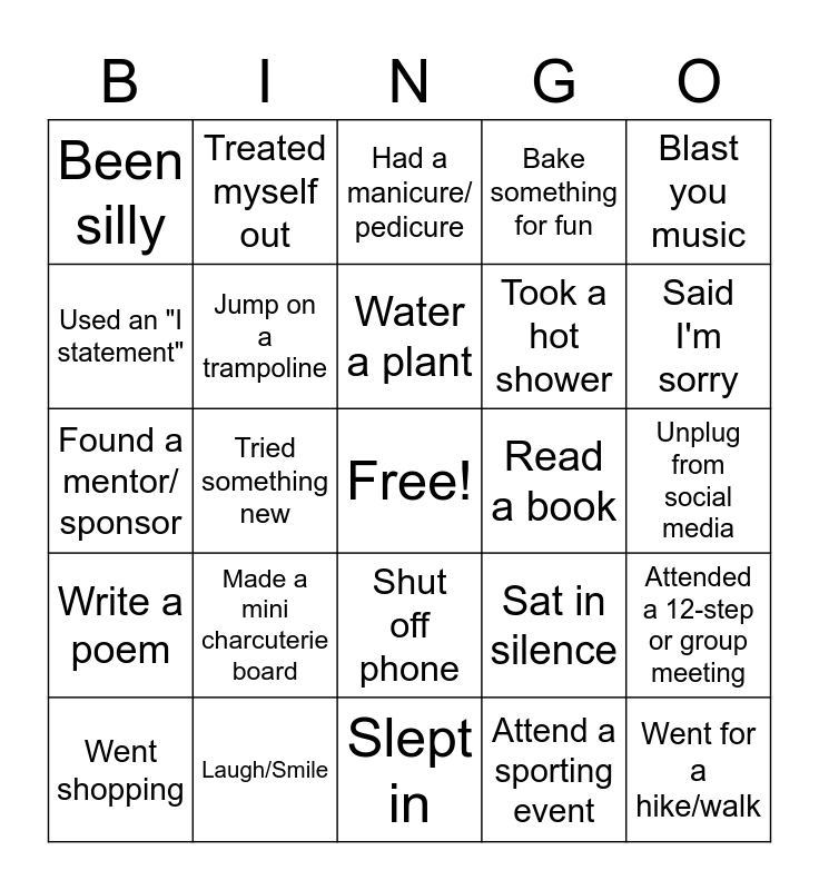 This bingo card has a free space and 49 words: Moved my body joyfully, Went for a hike/walk, Ate you veggies, Slept in, Made a mini charcuterie board, Do absolutely nothing, Treated myself out, Did something spontaneous, Used an "I statement", Set boundaries, Jump on a trampoline, Bake something for fun, Attended a 12-step or group meeting, Sat in silence, Showed empathy, Light a candle, Water a plant, Read a book, Attended a church or spiritual community service, Blast you music, Tried something new, Attend a sporting event, Been silly, Took a hot shower, Read the newspaper, Said I'm sorry, Went shopping, Daydream, Shut off phone, Write a poem, Style your hair different, Play with your pet, Gave myself a compliment, say no to booze, Laugh/Smile, Forgive someone, Went to bed early, Said hello to a stranger, Unplug from social media, Order take out, Read a book, Binged on TV, Buy yourself some flowers, Went to the farmer's market, Found a mentor/ sponsor, Had a manicure/ pedicure, Listened to outdoor sounds, Watch the clouds and Gaze at the stars.