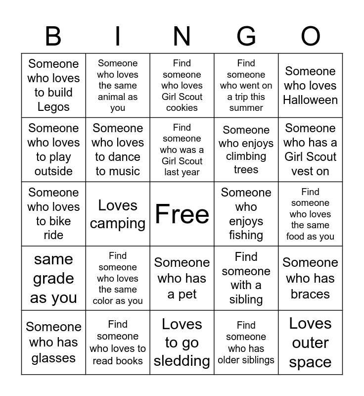 This bingo card has a free space and 24 words: Find someone who loves the same color as you, Find someone who loves to read books, Find someone who was a Girl Scout last year, Someone who has glasses, Someone who loves Halloween, Someone who loves to build Legos, Someone who loves to play outside, Someone who loves the same animal as you, Someone who enjoys fishing, Someone who has a pet, Someone who enjoys climbing trees, Someone who loves to bike ride, Find someone with a sibling, Someone who has braces, Someone who loves to dance to music, Find someone who has older siblings, Find someone who loves the same food as you, Find someone who loves Girl Scout cookies, Someone who has a Girl Scout vest on, Loves camping, Loves outer space, same grade as you, Find someone who went on a trip this summer and Loves to go sledding.