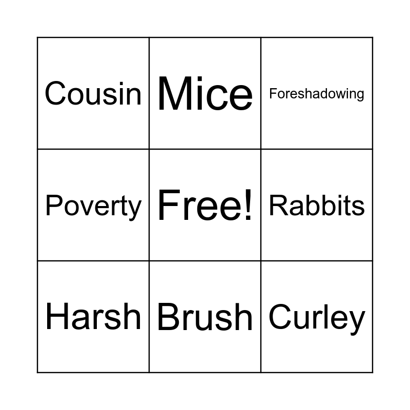 This bingo card has a free space and 25 words: The Great Depression, Weed, Brush, Candy, Curley, Cousin, Rabbits, Mice, American Dream, Built, Child-like, Pets soft things, Innocent, Strict, Harsh, Dependable, Guarded, Foreshadowing, Ethical, Simile, False, Unemployment, Recession, Poverty and Relationship breakdown.