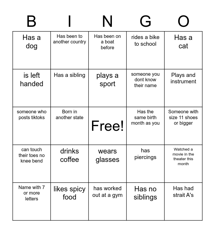 This bingo card has a free space and 24 words: drinks coffee, likes spicy food, plays a sport, Name with 7 or more letters, Has a cat, Has a dog, is left handed, Has been to another country, Has the same birth month as you, wears glasses, someone you dont know their name, someone who posts tiktoks, has piercings, Watched a movie in the theater this month, Has a sibling, Has no siblings, Someone with size 11 shoes or bigger, Has been on a boat before, Plays and instrument, Born in another state, Has had strait A's, can touch their toes no knee bend, rides a bike to school and has worked out at a gym.