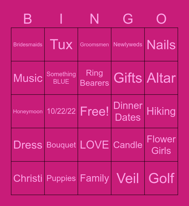 This bingo card has a free space and 29 words: Christi, Stephen, 10/22/22, Wedding Dress, Bridesmaids, Groomsmen, Something BLUE, Bouquet, Dinner Dates, Puppies, Hiking, Golf, Family, Veil, Altar, Rings, LOVE, Dress, Nails, Honeymoon, Candle, Friends, Gifts, Music, Newlyweds, Tux, Flower Girls, Ring Bearers and Pastor.