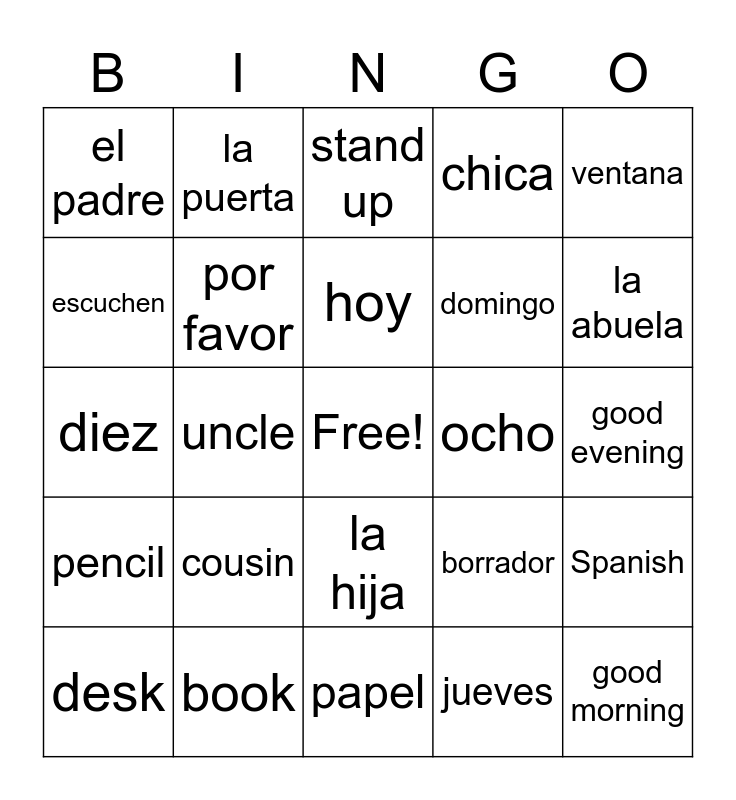 This bingo card has a free space and 24 words: cousin, book, hoy, desk, ventana, el padre, escuchen, la puerta, ocho, la hija, domingo, diez, borrador, Spanish, por favor, jueves, good evening, stand up, la abuela, uncle, good morning, pencil, chica and papel.