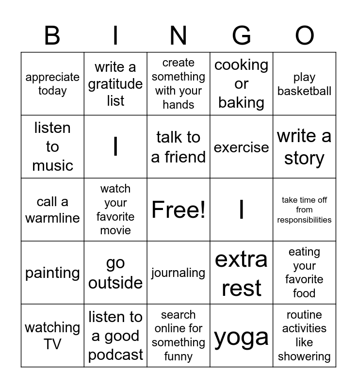 This bingo card has a free space and 25 words: go outside, search online for something funny, talk to a friend, watching TV, play basketball, appreciate today, listen to music, write a gratitude list, I, journaling, exercise, call a warmline, extra rest, eating your favorite food, I, eating 3 healthy meals a day, take time off from responsibilities, create something with your hands, write a story, watch your favorite movie, routine activities like showering, listen to a good podcast, painting, cooking or baking and yoga.