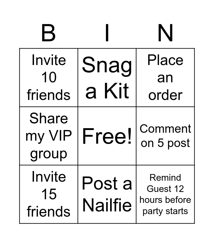This bingo card has a free space and 10 words: Post a Nailfie, Place an order, Invite 10 friends, Remind Guest 12 hours before party starts, Share my VIP group, Invite 15 friends, Snag a Kit, Suggest 2 friends who would be great host, Comment on 5 post and Play a game.