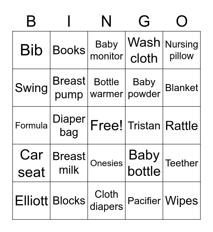 This bingo card has a free space and 29 words: Elliott, Crib, Diaper bag, Baby lotion, Bib, Baby monitor, Breast pump, Breast milk, Tristan, Blocks, Rattle, Wipes, Cloth diapers, Pacifier, Blanket, Baby shampoo, Onesies, Car seat, Nursing pillow, Formula, Baby bottle, Stroller, Baby powder, Swing, Wash cloth, Books, Teether, Bottle warmer and Sound machine.