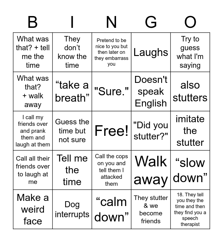 This bingo card has a free space and 24 words: Tell me the time, Dog interrupts, "Sure.", Make a weird face, Try to guess what I'm saying, What was that? + tell me the time, What was that? + walk away, They don’t know the time, "Did you stutter?", Call the cops on you and tell them I attacked them, Doesn't speak English, I call my friends over and prank them and laugh at them, Walk away, “slow down”, “take a breath”, They stutter & we become friends, imitate the stutter, Pretend to be nice to you but then later on they embarrass you, also stutters, Guess the time but not sure, 18. They tell you they the time and then they find you a speech therapist, Call all their friends over to laugh at me, Laughs and “calm down”.