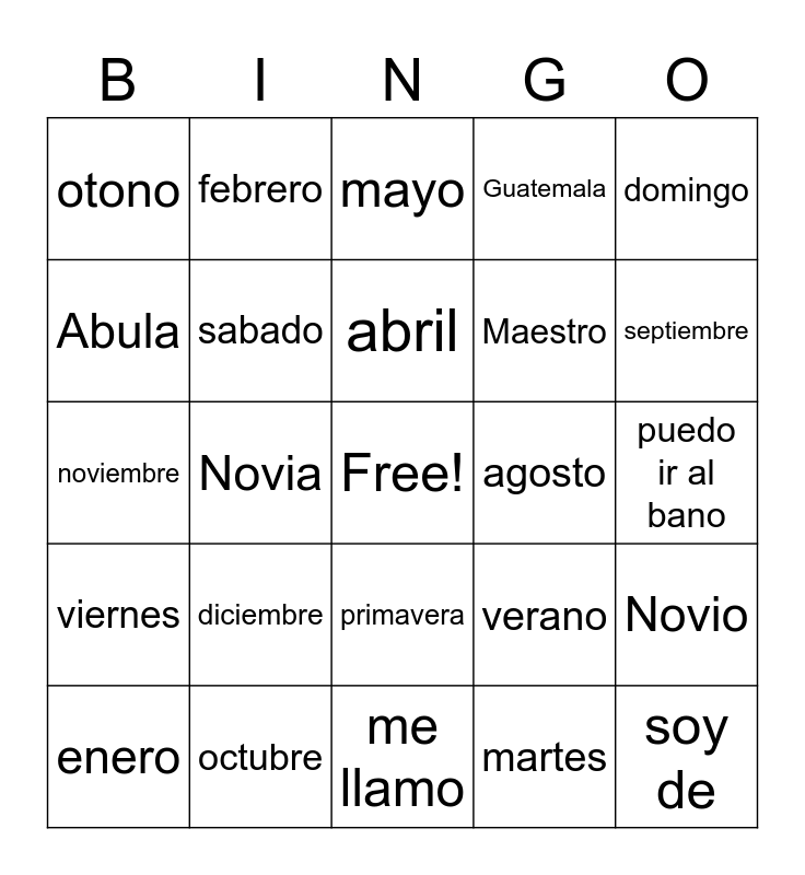 This bingo card has a free space and 34 words: lunes, martes, miercoes, jueves, viernes, sabado, domingo, enero, febrero, marzo, abril, mayo, junio, julio, agosto, septiembre, octubre, noviembre, diciembre, verano, primavera, invierno, otono, puedo ir al bano, me llamo, soy de, Guatemala, Honduras, Maestro, Abula, Abuelo, Novia, Novio and Ms. Terrell.