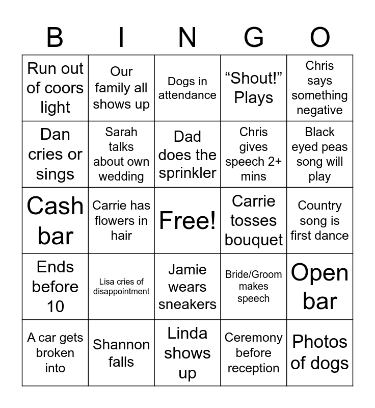 This bingo card has a free space and 24 words: Lisa cries of disappointment, Shannon falls, Dad does the sprinkler, A car gets broken into, Chris says something negative, Run out of coors light, Dan cries or sings, Our family all shows up, Carrie tosses bouquet, Jamie wears sneakers, Chris gives speech 2+ mins, Cash bar, Bride/Groom makes speech, Open bar, Sarah talks about own wedding, Ceremony before reception, Country song is first dance, Dogs in attendance, Black eyed peas song will play, Carrie has flowers in hair, Photos of dogs, Ends before 10, “Shout!” Plays and Linda shows up.