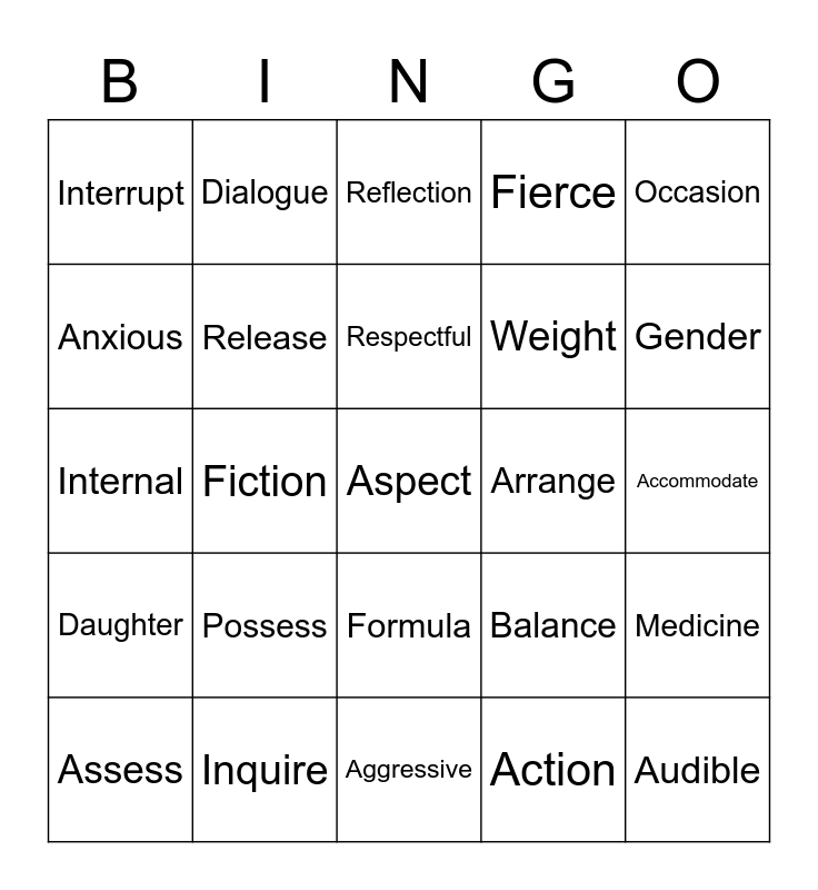 This bingo card has a free space and 24 words: Possess, Inquire, Respectful, Assess, Occasion, Interrupt, Anxious, Dialogue, Arrange, Formula, Weight, Internal, Balance, Medicine, Release, Action, Accommodate, Reflection, Gender, Fiction, Audible, Daughter, Fierce and Aggressive.