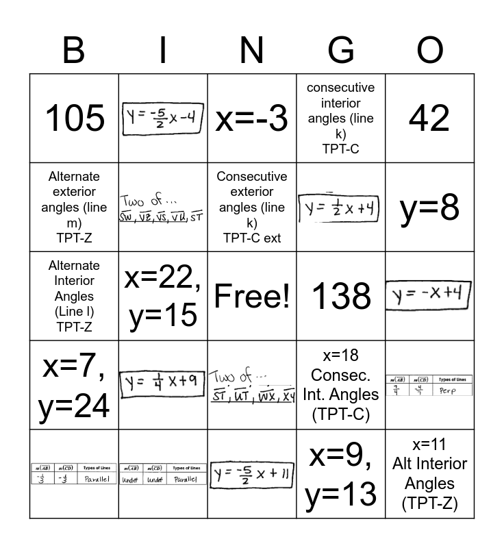 This bingo card has 14 images, a free space and 21 words: plane ZYU, consecutive interior angles (line k) TPT-C, Alternate exterior angles (line m) TPT-Z, None, Consecutive exterior angles (line k) TPT-C ext, Corresponding Angles (line j) TPT-F, Alternate Interior Angles (Line l) TPT-Z, 42, 75, 63, 105, 138, x=9, y=13, x=22, y=15, x=7, y=24, x=11 Alt Interior Angles (TPT-Z), x=18 Consec. Int. Angles (TPT-C), x=-3, y=8, Perpendicular and Parallel.