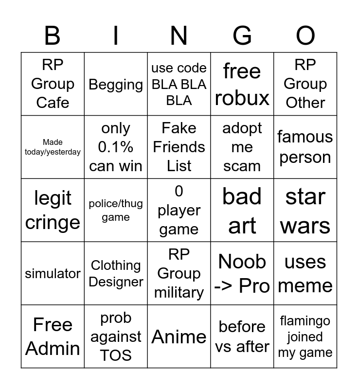 This bingo card has 25 words: Clothing Designer, Anime, Fake Friends List, Free Admin, RP Group Other, RP Group Cafe, Made today/yesterday, Begging, bad art, RP Group military, adopt me scam, legit cringe, Noob -> Pro, uses meme, only 0.1% can win, flamingo joined my game, star wars, use code BLA BLA BLA, famous person, police/thug game, 0 player game, prob against TOS, simulator, free robux and before vs after.