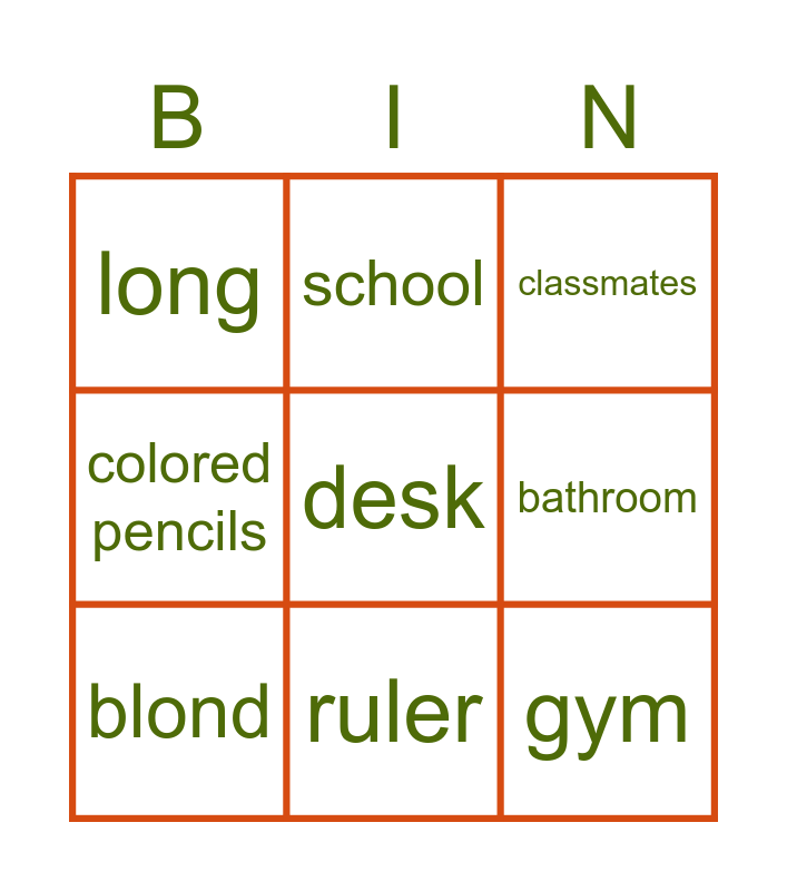 This bingo card has 30 words: straight, schoolbag, board, dark, long, classmates, blond, curly, short, eyes, name, surname, teacher, chair, playground, number, phone, lost, ears, desk, window, classroom, school, gym, bathroom, colored pencils, eraser, notebook, ruler and pencil case.