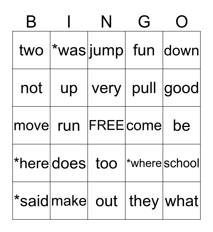 This bingo card has a free space and 24 words: does, make, very, *said, down, two, not, *was, come, too, pull, move, *where, school, up, they, be, jump, good, run, what, *here, fun and out.