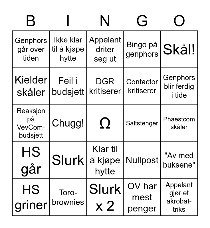 This bingo card has a free space and 24 words: Slurk, Toro-brownies, DGR kritiserer, HS griner, Skål!, Genphors går over tiden, Kielder skåler, Ikke klar til å kjøpe hytte, Saltstenger, Klar til å kjøpe hytte, Contactor kritiserer, Reaksjon på VevCom-budsjett, Nullpost, "Av med buksene", Feil i budsjett, OV har mest penger, Phaestcom skåler, Appelant driter seg ut, Genphors blir ferdig i tide, Chugg!, Appelant gjør et akrobat-triks, HS går, Bingo på genphors and Slurk x 2.